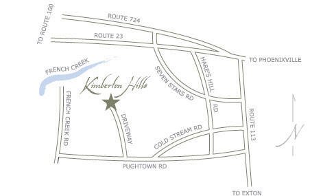 Take I76 west to 202 south. Exit at 252 and go north through Valley Forge Park to 23.Turn left on 23. Take 23 through Phoenixville to 113 (about 6 miles) and turn left (south) on 113. Take 113 south approx. 2 miles to Coldstream Road and turn right. Take Coldstream Road to where it ends at Kimberton Road. Turn left on Kimberton Road (which turns into Pughtown Rd). Kimberton Hills is 1.2 miles down on the right side of the road.